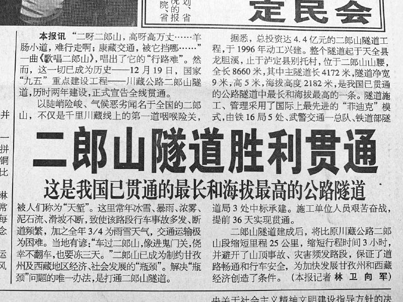 二郎山老路交通瓶頸,影響到甘孜州及西藏地區(qū)經(jīng)濟社會發(fā)展。1996年,二郎山隧道開建,歷時2年,于1998年底貫通。“二郎山隧道當時是全國最長、海拔最高、地質(zhì)最復雜的公路隧道,建設(shè)很不容易。”林衛(wèi)回憶,當年采訪建設(shè)二郎山隧道的鐵道部隧道局三處和武警交通一總隊時,曾聽聞隧道開挖中遇到的各種危險,一名現(xiàn)場指揮長就曾被卷入洪水,所幸后來死里逃生。