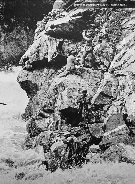 走過(guò)浮雕不到20米,一面組圖形成的墻面吸引了大量觀眾。一幅解放軍戰(zhàn)士在懸崖上開(kāi)路的照片給人帶來(lái)巨大的視覺(jué)沖擊,這是當(dāng)年川藏公路修筑時(shí)的一幕,文字注解寫(xiě)著:1954年12月,貫通“世界屋脊”的康藏公路、青藏公路全線通車(chē),結(jié)束了西藏沒(méi)有公路的歷史……1955年10月,康藏公路改名為川藏公路。