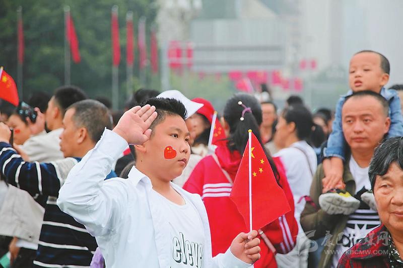 在內(nèi)江市大洲廣場(chǎng),許多市民臉上貼著國(guó)旗,歡欣地?fù)]動(dòng)著手中的五星紅旗。當(dāng)慷慨激昂的國(guó)歌響起,全場(chǎng)人員唱起國(guó)歌,對(duì)偉大祖國(guó)致以無限敬意和深深祝福。