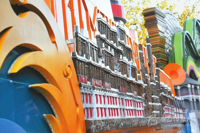 彩車上的汶川地震災(zāi)后重建的藏羌彝漢天府新民居浮雕。川報(bào)記者肖雨楊攝