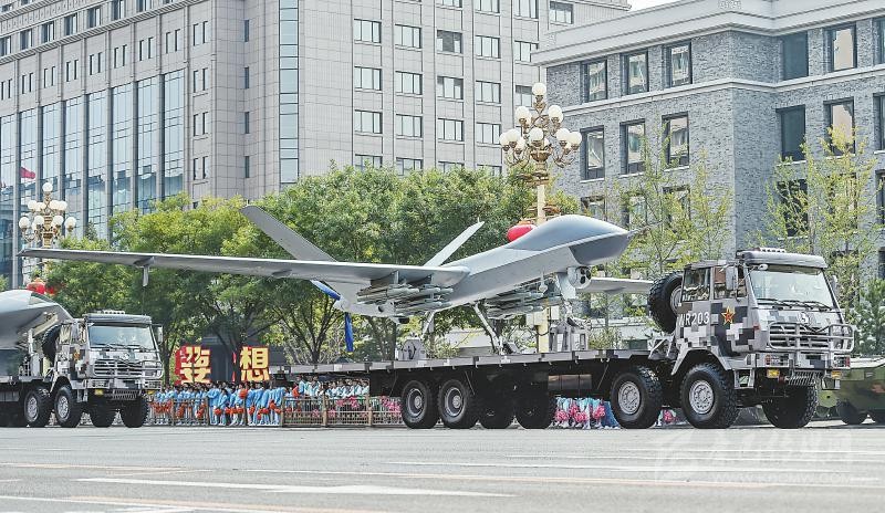 在兩輛指揮引導(dǎo)車(chē)帶領(lǐng)下,由攻擊-2無(wú)人機(jī)、攻擊-11無(wú)人機(jī)和反輻射無(wú)人機(jī)組成的無(wú)人作戰(zhàn)第2方隊(duì)通過(guò)天安門(mén),向世界展示了中國(guó)無(wú)人作戰(zhàn)平臺(tái)的又一嶄新成就。