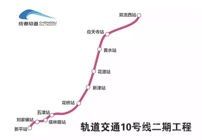 10號(hào)線二期起于一期雙流機(jī)場(chǎng)2航站樓站,串聯(lián)了雙流機(jī)場(chǎng)、雙流西客運(yùn)樞紐至新津主城區(qū),止于新津縣新平鎮(zhèn),線路全長(zhǎng)27.06km,高架段及過(guò)渡段設(shè)車(chē)站10座,其中地下站5座,高架站5座。