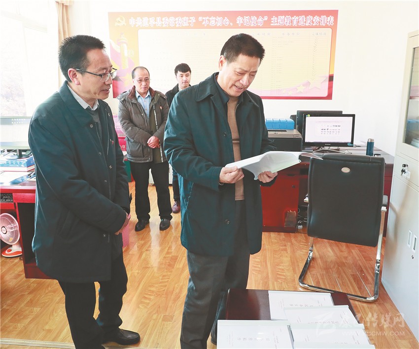 圖為劉成鳴在道孚縣主題教育領(lǐng)導(dǎo)小組辦公室查看主題教育資料。