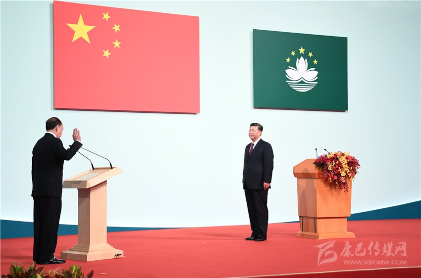 慶祝澳門回歸祖國(guó)20周年大會(huì)暨澳門特別行政區(qū)第五屆政府就職典禮20日上午在澳門東亞運(yùn)動(dòng)會(huì)體育館隆重舉行。中共中央總書記、國(guó)家主席、中央軍委主席習(xí)近平出席并發(fā)表重要講話。他指出,澳門回歸祖國(guó)20年來,澳門特別行政區(qū)政府和社會(huì)各界人士同心協(xié)力,開創(chuàng)了澳門歷史上最好的發(fā)展局面,譜寫了具有澳門特色的“一國(guó)兩制”成功實(shí)踐的華彩篇章。他希望澳門特別行政區(qū)新一屆政府和社會(huì)各界人士站高望遠(yuǎn)、居安思危,守正創(chuàng)新、務(wù)實(shí)有為,在已有成就的基礎(chǔ)上推動(dòng)澳門特別行政區(qū)各項(xiàng)建設(shè)事業(yè)躍上新臺(tái)階。