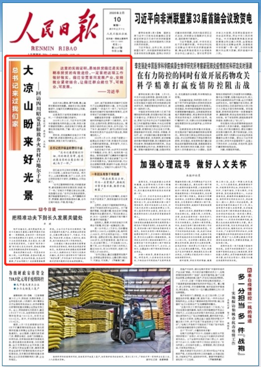 2月10日出版的《人民日報》,在頭版刊登了《大涼山盼來好光景》的報道,聚焦四川昭覺縣解放鄉(xiāng)火普村易地扶貧搬遷,村民不等不靠不要,積極發(fā)展種養(yǎng)業(yè),彝家兒女奔向充滿希望的新生活。