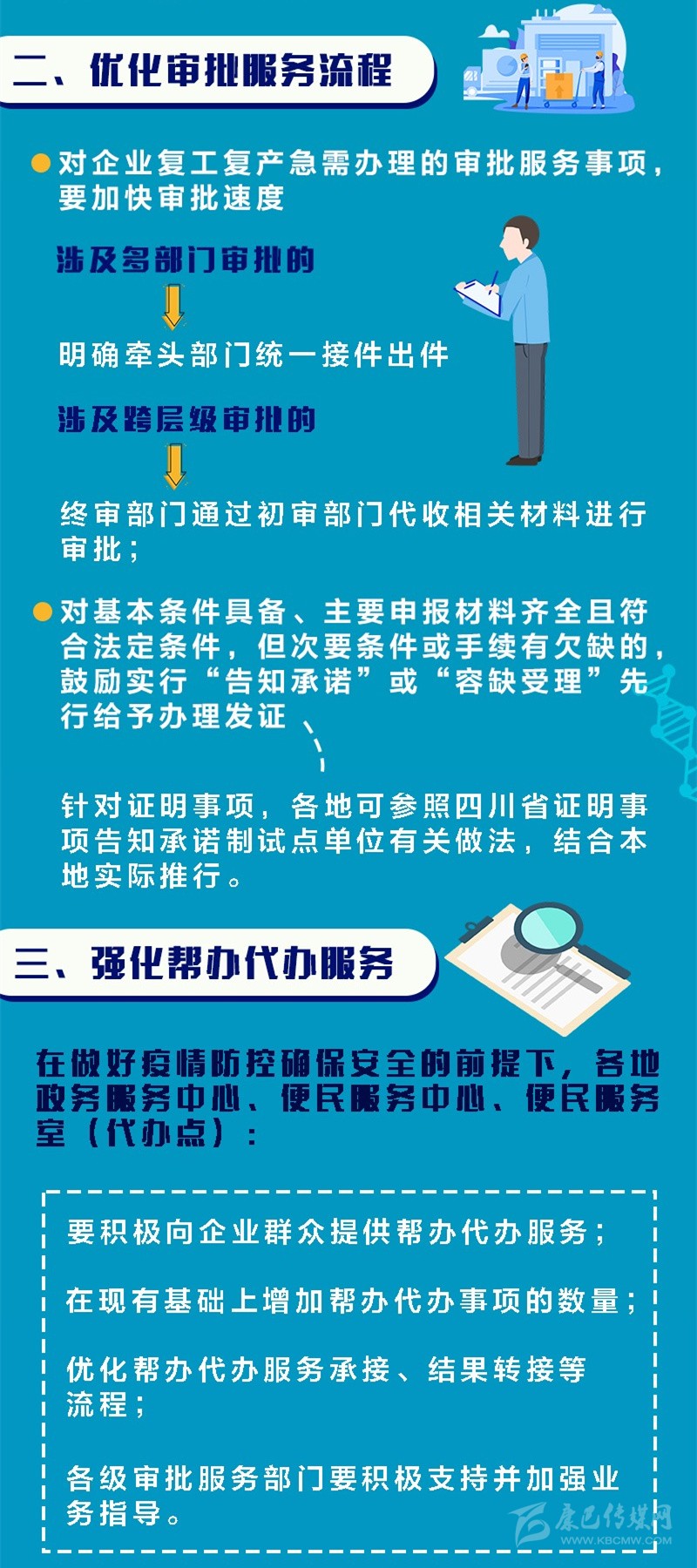 答:優(yōu)化服務流程,輔以靈活使用“告知承諾”和“容缺受理”等辦理方式。對企業(yè)復工復產(chǎn)急需辦理的審批服務事項,要加快審批速度,涉及多部門審批的,明確牽頭部門統(tǒng)一接件出件;涉及跨層級審批的,終審部門通過初審部門代收相關材料進行審批。