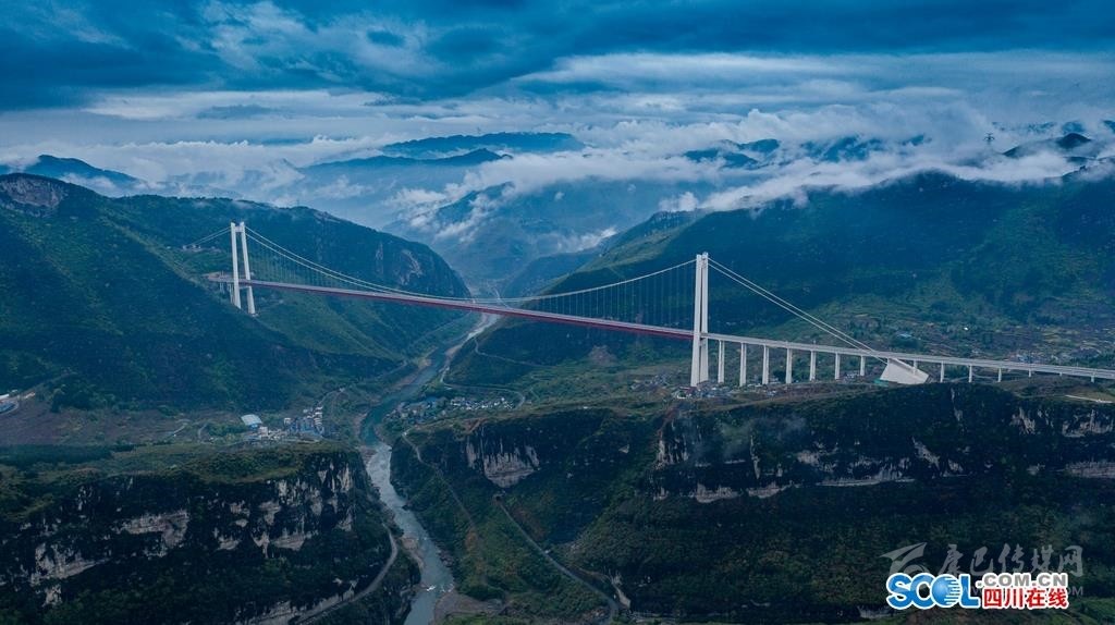 4月11日,雨后的瀘州市古藺縣的赤水河紅軍大橋在云霧中,大橋橫跨赤水河兩岸,連接川黔兩地,在連綿的烏蒙山中更加壯觀。赤水河大橋主橋跨徑1200米,為雙塔單跨鋼桁梁懸索橋,索塔采用門形框架鋼筋混凝土結(jié)構(gòu),貴州岸塔高243.5米,是世界山區(qū)峽谷同類型橋梁中第一高塔,同時也是國內(nèi)山區(qū)峽谷同類型橋梁第二跨度的鋼桁梁懸索橋。作為四川南向出川大通道,增強(qiáng)了川南、黔北、渝西等地的經(jīng)濟(jì)聯(lián)系。
