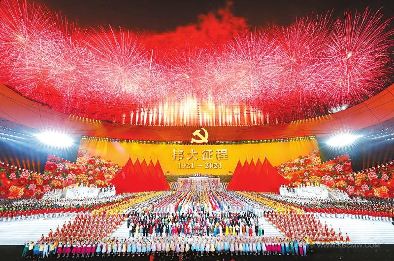 舞臺中央,3000多名紅衣青年舉起發(fā)光道具,組成熠熠發(fā)光的黨徽;“鳥巢”上空,絢爛的焰火升騰綻放,化作“100”的紀年字樣;紅色看臺上,觀眾的熱情被瞬間點燃,掌聲歡呼聲響徹夜空……