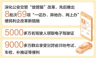 今年12月2日是第十個(gè)“全國交通安全日”,最新數(shù)據(jù)顯示,我國機(jī)動(dòng)車和駕駛?cè)藬?shù)量持續(xù)增長,目前機(jī)動(dòng)車保有量已達(dá)3.93億輛,駕駛?cè)诉_(dá)4.79億人。面對道路交通大發(fā)展的新形勢、人民群眾日益增長的新需求,公安部不斷深化公安交管“放管服”改革,先后推出8批次69項(xiàng)“一證辦、異地辦、網(wǎng)上辦”便民利企改革新措施,為群眾和企業(yè)減少辦事成本800多億元。