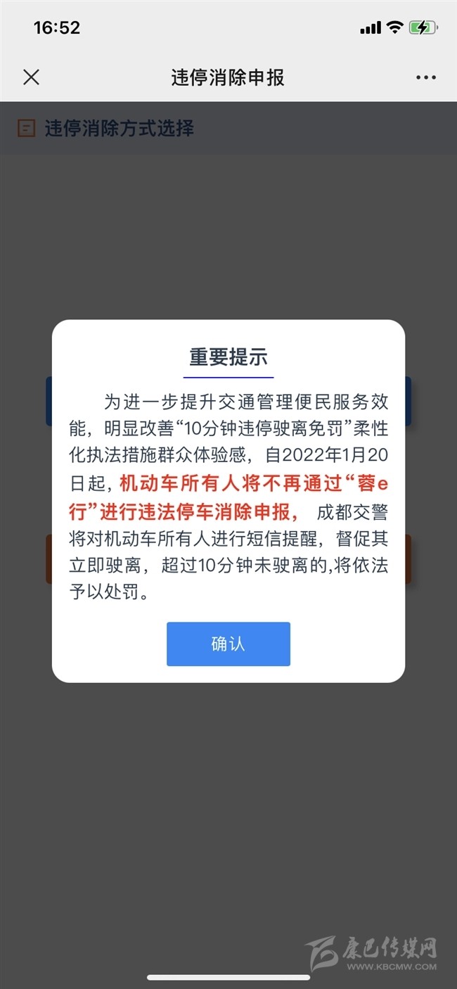 今天,記者獲悉,為進(jìn)一步提升交通管理便民服務(wù)效能,明顯改善“10分鐘違停駛離免罰”柔性化執(zhí)法措施群眾體驗(yàn)感,自2022年1月20日起, 機(jī)動(dòng)車所有人將不再通過“蓉e行”進(jìn)行違法停車消除申報(bào),成都交警將對(duì)機(jī)動(dòng)車所有人進(jìn)行短信提醒,督促其立即駛離,超過10分鐘未駛離的,將依法予以處罰。