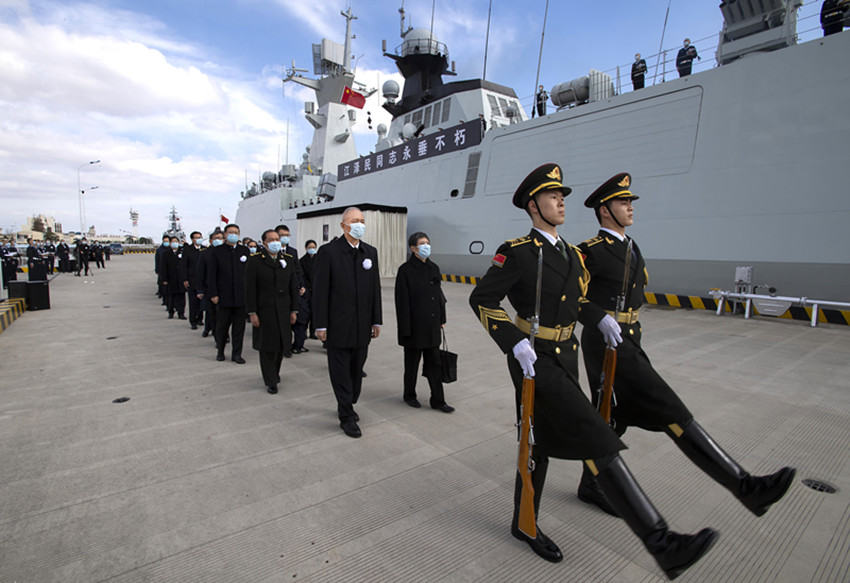 中國人民解放軍海軍揚州艦伏波靜臥,艦上官兵分區(qū)列隊、肅立舷邊。揚州是江澤民同志的故鄉(xiāng)。今天,這艘以揚州命名的軍艦,以最高禮儀送別這位為黨和人民建立了不朽功勛的卓越領(lǐng)導(dǎo)人。江澤民同志的親屬捧護著骨灰登上揚州艦。海軍笛吹響,儀仗隊持槍肅立,行注目禮。當揚州艦起航時,軍港內(nèi)所有艦船汽笛長鳴,響徹云霄。