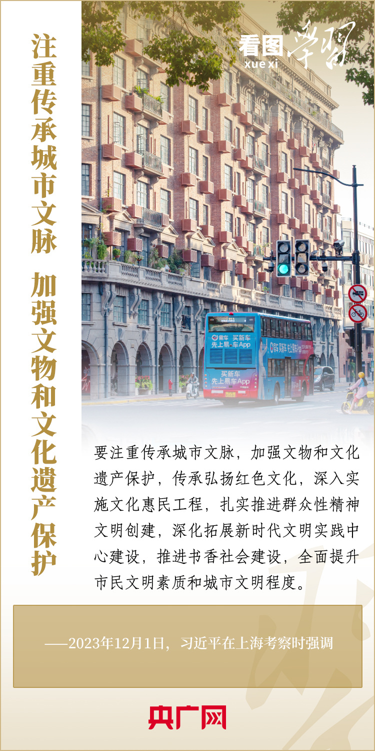 歷史是一座城市的記憶,文化是一座城市的靈魂。守護(hù)城市的歷史文化,就是守護(hù)城市的生命力。習(xí)近平總書(shū)記在歷次國(guó)內(nèi)考察中多次作出深刻闡述。近日,總書(shū)記在上??疾鞎r(shí),要求上海加快建成具有世界影響力的社會(huì)主義現(xiàn)代化國(guó)際大都市,并強(qiáng)調(diào)上海要注重傳承城市文脈,加強(qiáng)文物和文化遺產(chǎn)保護(hù)。一起來(lái)學(xué)習(xí)!