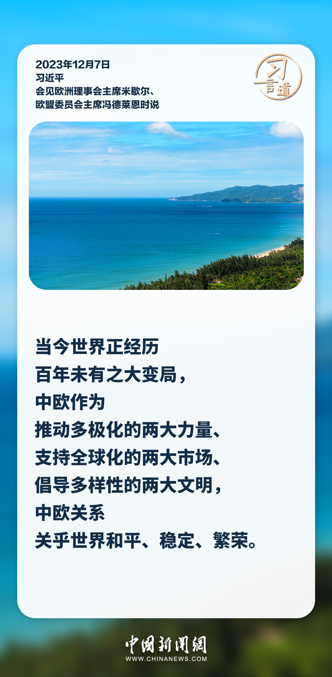 12月7日,國家主席習(xí)近平會見來華舉行第二十四次中國—歐盟領(lǐng)導(dǎo)人會晤的歐洲理事會主席米歇爾和歐盟委員會主席馮德萊恩,雙方就事關(guān)中歐關(guān)系的戰(zhàn)略性問題,以及中歐各領(lǐng)域?qū)υ捄献鳌㈦p方重點關(guān)切、全球治理、國際和地區(qū)熱點問題等深入坦誠交換看法,并就一系列問題達(dá)成重要共識。今年是中歐建立全面戰(zhàn)略伙伴關(guān)系20周年,習(xí)主席強調(diào),中歐關(guān)系具有戰(zhàn)略意義和世界影響,關(guān)乎世界和平、穩(wěn)定、繁榮。一起來學(xué)習(xí)!