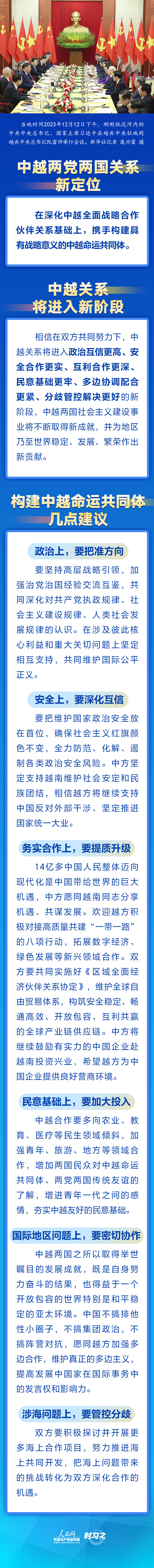 當(dāng)?shù)貢r間2023年12月12日下午,剛剛抵達(dá)河內(nèi)的中共中央總書記、國家主席習(xí)近平在越共中央駐地同越共中央總書記阮富仲舉行會談。雙方宣布中越兩黨兩國關(guān)系新定位,在深化中越全面戰(zhàn)略合作伙伴關(guān)系基礎(chǔ)上,攜手構(gòu)建具有戰(zhàn)略意義的中越命運共同體。