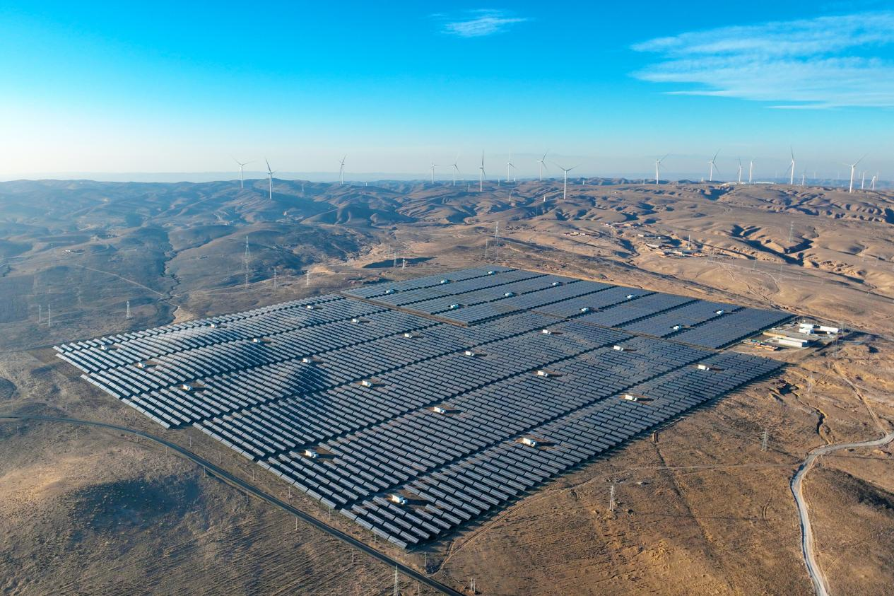 △ 2024年1月3日,寧夏銀川,俯瞰靈武市境內(nèi)的“沙戈荒”光伏基地,一塊塊藍色光伏板源源不斷地輸送著綠色電能。