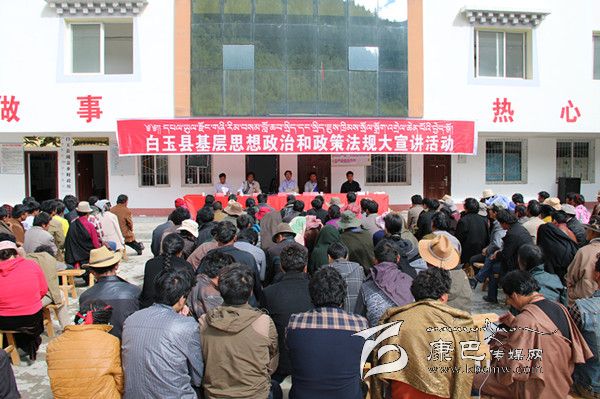 ?。冈碌陌子?,烈日當(dāng)頭,秋高氣爽。31日上午,絨蓋鄉(xiāng)政府大院內(nèi),白玉縣基層思想政治和政策法規(guī)大宣講活動(dòng)正在這里精彩“上演”,400多名前來(lái)“聽(tīng)課”的各村群眾正津津有味地品味著縣宣講團(tuán)成員松吉尼瑪通俗易懂的藏語(yǔ)大宣講。從黨的十八大到十八屆三中全會(huì)精神,從糧食直補(bǔ)到低保、新農(nóng)保,從養(yǎng)老保險(xiǎn)、殘疾人幫扶到相關(guān)法律法規(guī),宣講者深入淺出,傾聽(tīng)者全神貫注。
