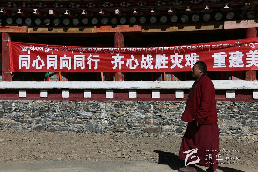 記者注意到,在金龍寺大門(mén)處的圍墻上貼著一面寫(xiě)有“同心同向,共渡難關(guān),重建家園”的紅色橫幅,一位僧人口中念念有詞,走過(guò)橫幅,向新搭建的救災(zāi)帳篷走去,另一位僧人則拿著一柄鋤頭走出寺院大門(mén),隨同另一批救災(zāi)人員去處理前幾日垮塌在地的石頭。