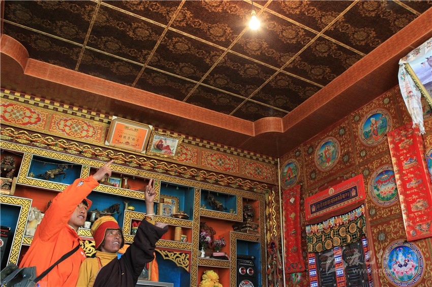 格吉大爺今年70歲了,他的孫子貢嘎是一名藏畫家,主要靠給鄉(xiāng)鄰的新房畫壁畫為生。他和哥哥兩人自學(xué)成才,鄉(xiāng)里很多人家屋內(nèi)那些精美絕倫的壁畫就出自他們兩兄弟之手。“以前電不好時,天黑就無法工作,現(xiàn)在有電了,晚上都能畫,曾經(jīng)要畫1個多月的壁畫,現(xiàn)在20多天就能完成。如今電好了,電話信號也比以前強,好多理塘縣城的朋友都打電話請我去給他們家里畫,這樣又能多掙些錢。”貢嘎的話語里透著對未來的幸福生活憧憬。