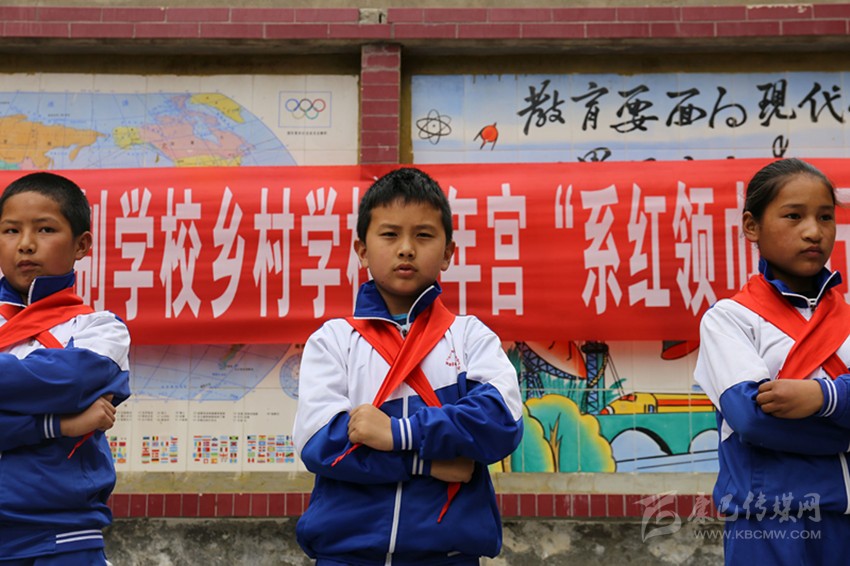 圖為少先隊(duì)員展示系紅領(lǐng)巾。