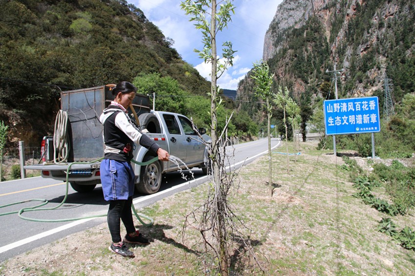 植樹容易,保持存活率很難。“植樹植樹,一分栽九分管。我們植樹造林不只看數(shù)量,更注重質(zhì)量,注重栽植方法和科學(xué)的后期養(yǎng)護管理,保證樹木的成活率。”6月11日,在白玉縣絨蓋鄉(xiāng),長江造林局駐白玉管護站站長梁榮忙著進行現(xiàn)場管護技術(shù)指導(dǎo),“把遮陽網(wǎng)裹緊點、把刺巴綁緊點,以免牛和馬啃皮子;水要澆透,不然水分不夠,樹子一斷水,再想‘返陽’就難了;護欄水泥樁要栽牢,不然牛馬一撞就倒了……”。