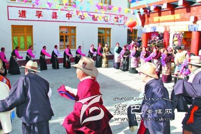 1月29日晚,2014年“情暖道孚”迎新春聯(lián)歡晚會(huì)在道孚縣影劇院激情上演,來(lái)自該縣片區(qū)群眾代表隊(duì)、民間鍋莊隊(duì)、專業(yè)民族藝術(shù)團(tuán)和在外求學(xué)的莘莘學(xué)子們載歌載舞,以精彩的表演為觀眾們帶來(lái)了一場(chǎng)頗具當(dāng)?shù)孛褡逄厣奈幕⒀?,吸引?000余名干部群眾觀看。