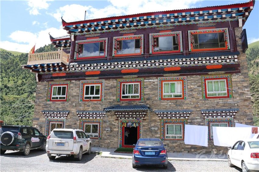 該酒店三樓一底,集餐飲、停車、住宿為一體,設(shè)單標(biāo)間和套房共計22間38個床位,雇傭了3名當(dāng)?shù)卮迕駧凸?,院?nèi)甚至配套了超市和茶樓;藏文化元素俯仰皆是,雕梁畫棟,規(guī)模配備,儼已成為全縣鄉(xiāng)鎮(zhèn)一道亮麗風(fēng)景。不論淡旺季,每間房價188元至258元不等。夏季正值入住高峰期,8月以來,幾乎天天客滿。