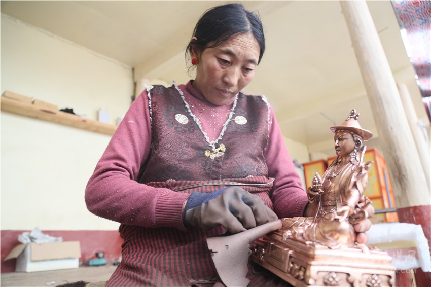 一雙粗糙而靈巧的手正一絲不茍地對銅像進行最后的打磨。這是一雙執(zhí)著于銅鑄工藝43年的手。尼瑪從7歲開始學(xué)習(xí)銅鑄手藝,是該項工藝的州級非物質(zhì)文化傳承人。