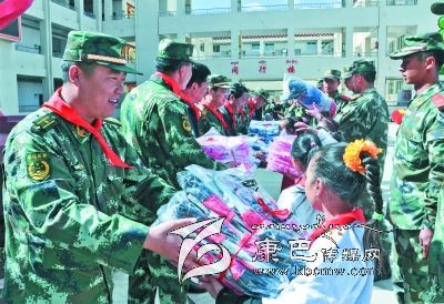 儀式上,8722部隊(duì)向?qū)W校贈(zèng)送了價(jià)值萬(wàn)余元的學(xué)習(xí)用品,拿著裝有鉛筆、水彩筆等各種文具的“愛心書包”,孩子們興奮不已。12歲的藏族女生登真啟珍告訴筆者:“今年的‘六一’兒童節(jié),武警部隊(duì)的叔叔們專門來看望我們,還送來了禮物,我感到特別開心。”儀式上,少先隊(duì)員們給參加慰問的部隊(duì)領(lǐng)導(dǎo)戴上鮮艷的紅領(lǐng)巾,孩子們還表演了精心排練的節(jié)目。一張張燦爛的笑臉,一陣陣蕩漾心扉的歌聲,傳遞著駐訓(xùn)武警部隊(duì)與當(dāng)?shù)厝罕姖鉂獾聂~水深情。