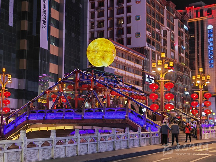 除了讓人眼前一亮的各種絢麗的花卉燈飾和被大紅燈籠、如意掛飾的大街小巷,最被市民津津樂道的莫過于中橋的明月景觀和東關U形廣場上的“五彩色神?!薄C髟戮坝^又稱《世界的康定》,此景觀以月球為主體,在橋兩側再輔助以音符及五線譜造型。其寓意為情歌唱響世界,康定名揚世界。而矗立在東關廣場上的新增雕塑景觀就更意義非凡了。雕塑通體是以一頭雄壯的牦牛形象呈現,牦牛下方的紅色高臺正前方鐫刻的是政府公仆一心為民的錚錚誓言?!罢臓I造喜慶洋洋的節(jié)日氛圍,讓我們感受到了濃濃的‘年味’,在黨和政府的關懷下,我們老百姓的生活一年更比一年好,幸福感也是一年更比一年強?!?5歲高齡的扎西激動地跟記者分享著他的喜悅。