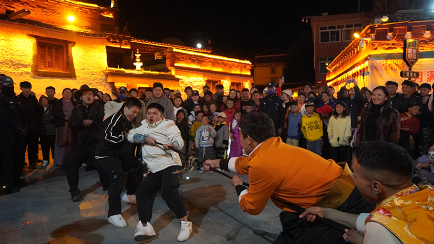 “加油、加油……”10月1日晚,在仁康小廣場(chǎng)上,遠(yuǎn)道而來的各地游客與理塘當(dāng)?shù)鼐用袢罕姸汲两诿袼谆顒?dòng)的歡樂節(jié)日氛圍中?,F(xiàn)場(chǎng)邀請(qǐng)游客進(jìn)行的三人拔河比賽,掀起了活動(dòng)高潮。“這里的氛圍讓我感到很舒服,也祝祖國母親生日快樂?!眮碜躁兾魑靼驳挠慰忘S家樂說。伴隨著各族群眾手拉手跳起的鍋莊舞,游客和群眾深切感受到民族大團(tuán)結(jié)的溫暖。
