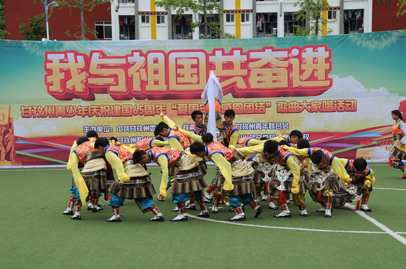 活動中,同學們先后演唱了《黃河頌》、《我愛您,中國!》、《夢圓中國》等多首紅色經(jīng)典歌曲。你方唱罷我登場,現(xiàn)場氣氛熱烈,高潮迭起。優(yōu)美的歌聲唱出了我青少年的愛國情懷,一面面飄揚的紅旗表達著對祖國的深情祝福。來自州職業(yè)技術學校、四川民族學院、省藏校、甘孜衛(wèi)校、州青聯(lián)委員以及我州著名歌手共1000多人放聲高歌,共同慶祝新中國成立65周年華誕。