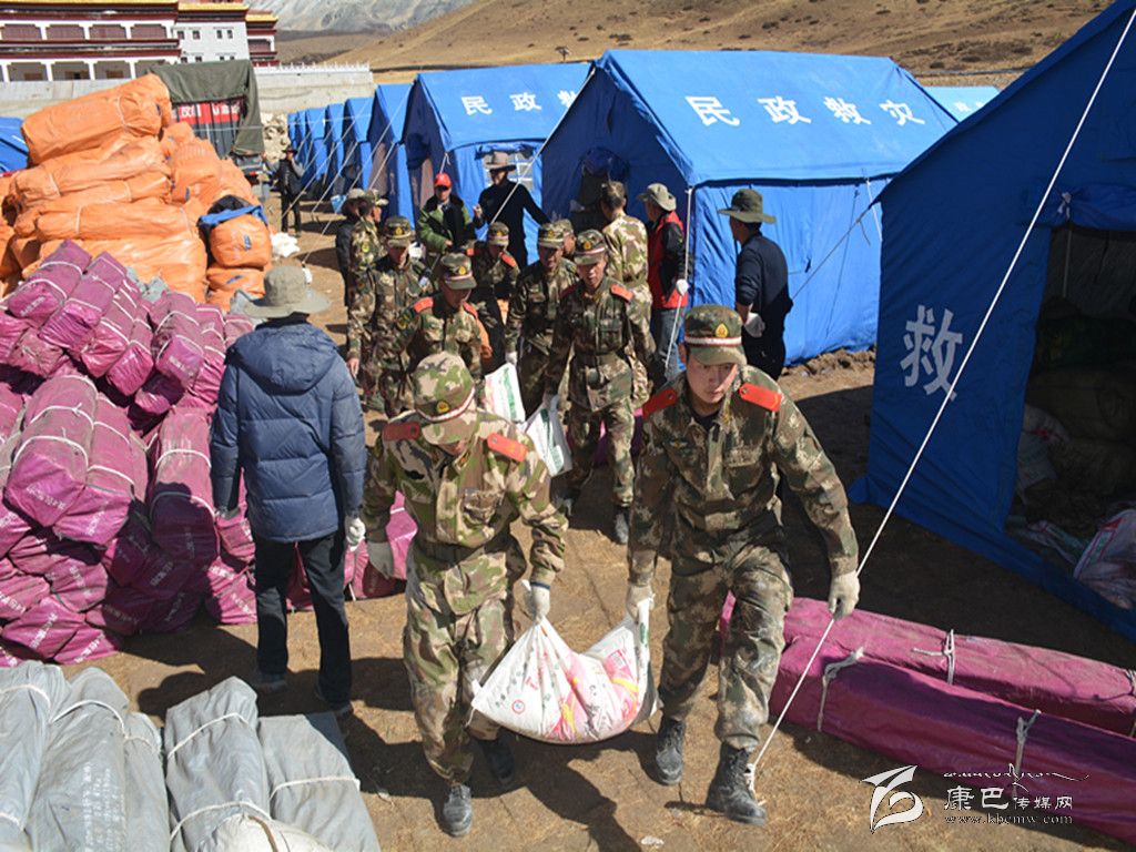 森警官兵在抗震救災(zāi)中搬運(yùn)生活物資。