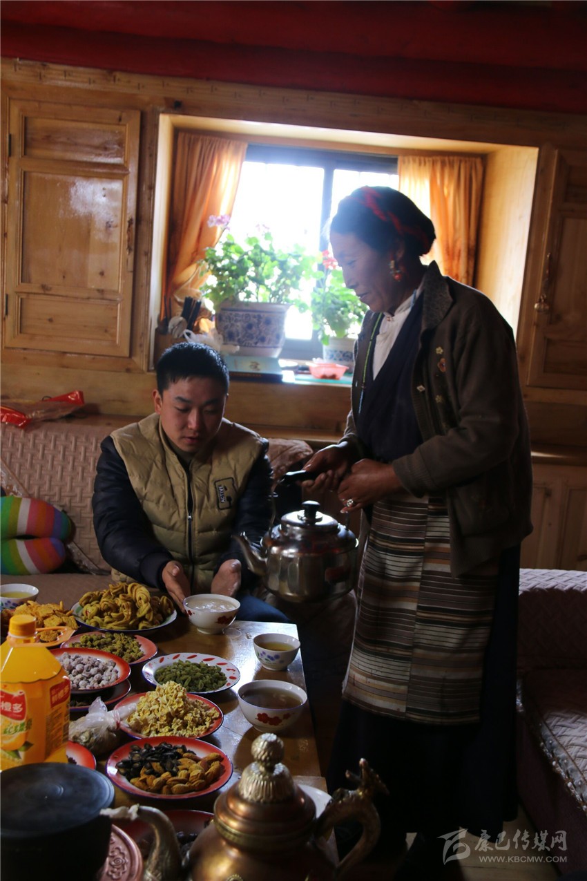 離開合作社,記者一行受邀前往村支部書記澤吉家里做客。汽車在整潔的入戶公路上行駛一陣后,一棟外觀精巧、色彩繽紛的寬大全木質(zhì)民居出現(xiàn)在記者眼前。走進客廳,幾張擺滿了各種水果、飲料、干果、糖、酥油果子的藏桌引起了記者的注意,一位十來歲的女孩正在觀看藏歷新年春晚。看到有客上門,澤吉的愛人立刻端來了熱騰騰的酥油茶和黃澄澄的青稞酒。