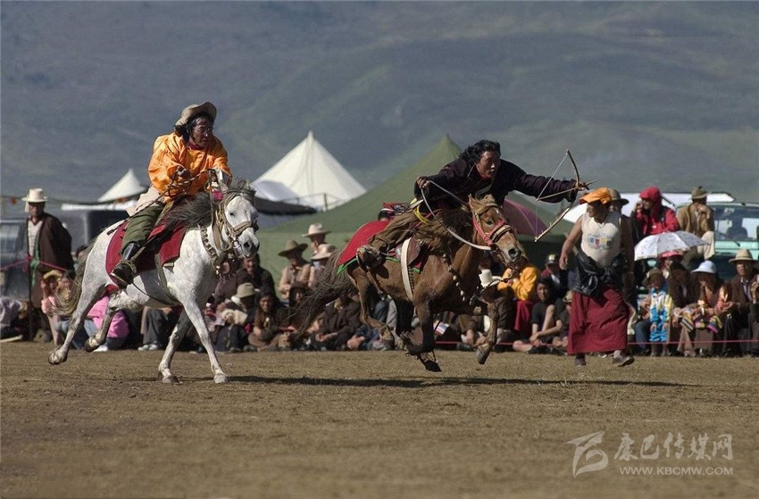 賽馬活動中的分耐力賽、小走賽、馬術表演等,馬術表演有馬背倒立、飛馬射擊、馬肚藏身、俯身拾哈達等項目。驚險刺激的賽馬,是充分展示藏區(qū)群眾健壯、靈巧和勇猛、膽大的一項活動,也是當地青壯年比拼其體魄、智慧和膽識的舞臺,對年輕小伙兒來說,這還是一個捕獲心儀的姑娘的芳心的絕好時機。所以,在康巴地區(qū)的賽馬活動始終都保持著精彩、激烈的特征。