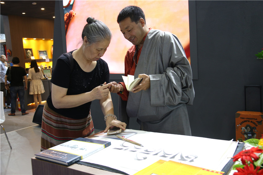 而在同一地點的另一側,省級藏文書法傳承人巴松鄧珠的藏文書法也吸引著眾多愛好書法市民前來觀賞,還有的與他合影?!爸笇н^我的書法家非常多,他們不僅給了我許多寶貴的意見,更重要的是給了我信心和動力,讓我堅持寫書法,并成為康體藏文書法的傳承人?!卑退舌囍檎f,這次能夠得到州委、州政府搭建的平臺,我會珍惜好這次難得的機遇,把作品展示好、宣傳好,讓全國各地的人們更多地了解我州民族文化。