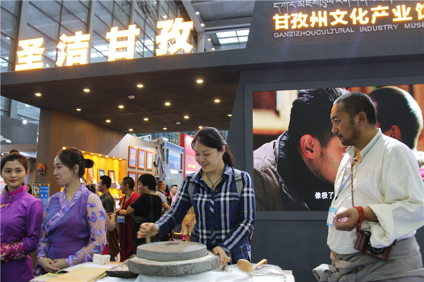 開館剛開始,我州獨特文化產業(yè)就吸引各方來客。在展廳正門前,德瓊莊園農業(yè)文化有限公司扎呷現(xiàn)場演藝磨子推糌粑,他一邊推,一邊說,糌粑是青稞炒熟后磨成的面,是天然的綠色食品,是藏民族千百年來的傳統(tǒng)主食之一。這時,很多市民都停住了腳步,品嘗產品的同時,也親手體驗這古老的手工磨具。