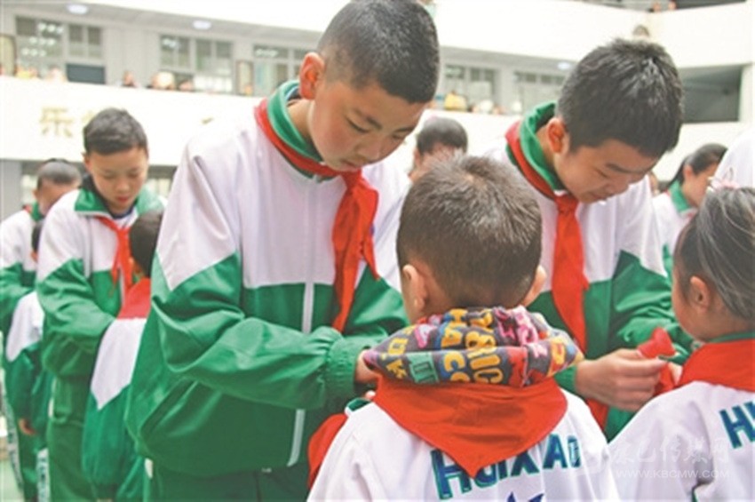 康定市回民小學(xué)六年級(jí)學(xué)生為新入隊(duì)學(xué)生佩戴紅領(lǐng)巾。