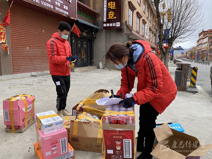 德格縣志愿者為商戶發(fā)放消毒用品。