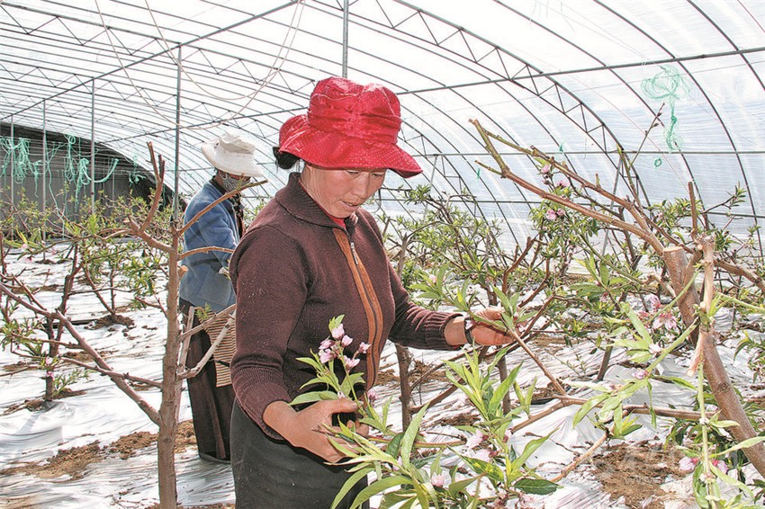 圖為當?shù)貏展まr(nóng)牧民正在給高原大棚桃樹疏枝。