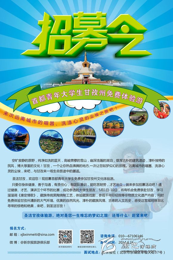 本網(wǎng)訊(本網(wǎng)記者)為進(jìn)一步宣傳展示甘孜州的康巴文化積淀與旅游特色,州委、州政府將舉辦“圣潔甘孜,走進(jìn)北京”的文化旅游周宣傳活動(dòng),在宣傳周前期推出了一個(gè)亮點(diǎn)活動(dòng),就是面向首都各高校公開(kāi)招募一批青年大學(xué)生赴甘孜州體驗(yàn)生活,讓他們走出都市,感受生態(tài)甘孜的藍(lán)天白云,感悟和諧甘孜的幸福文明,以他們的親身經(jīng)歷為樣本案例,見(jiàn)證新甘孜的獨(dú)特魅力。