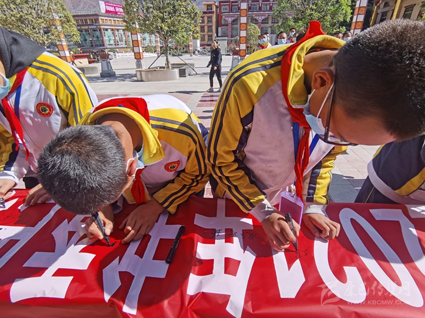 巴塘縣青少年在啟動儀式上簽字,倡導(dǎo)全民閱讀。