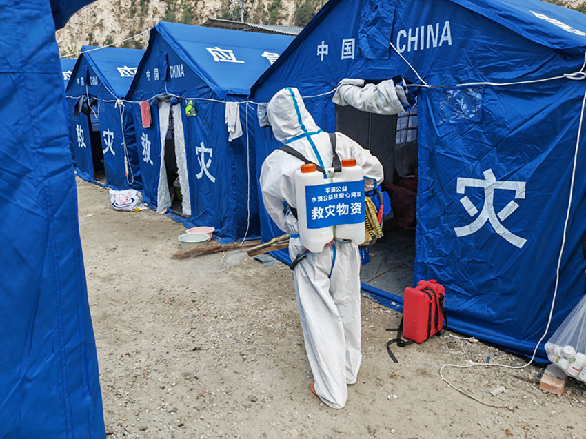 藏醫(yī)院醫(yī)務(wù)人員在地震災(zāi)區(qū)進(jìn)行消殺。