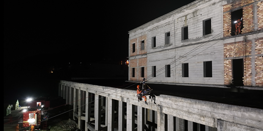 現(xiàn)場還模擬了孤島救援科目。因地震導(dǎo)致震中區(qū)域地質(zhì)松懈,呈塌陷現(xiàn)狀,水位下降,被困人員所在區(qū)域水位下降且通行道路損毀形成孤島。救援隊伍通過偵查,決定采取利用救生拋投器將繩索打至對岸形成橫渡條件,再利用T型繩索救助技術(shù)將人員和器材輸送至湖心島,通過破拆、頂撐技術(shù)將孤島被困的壓埋人員救出,隨后對被困人員包扎、固定后利用繩索將被困人員轉(zhuǎn)移至安全區(qū)域。