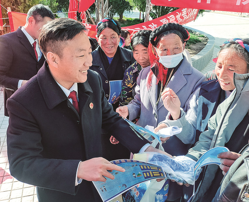 得榮縣檢察院檢察官倪華忠(左一)向群眾們開(kāi)展普法宣傳。
