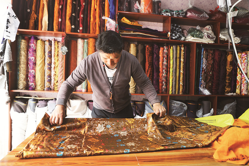 “傳統(tǒng)藏裝需要手工制作,青年、中年、老年人的款式各不一樣,料子也很有講究,還有裝飾也很重要……”說起登龍服飾,扎西澤仁神采飛揚,不時發(fā)出爽朗的笑聲,他說,“一般簡單的服裝制作僅需半天,復雜一些的要兩三天,價格從幾百元到幾千元不等。現(xiàn)在縣城的商店生意很好,每天都能接到很多訂單,在登龍鄉(xiāng)的鋪子交給徒弟打理也完全沒有問題?!?/span>