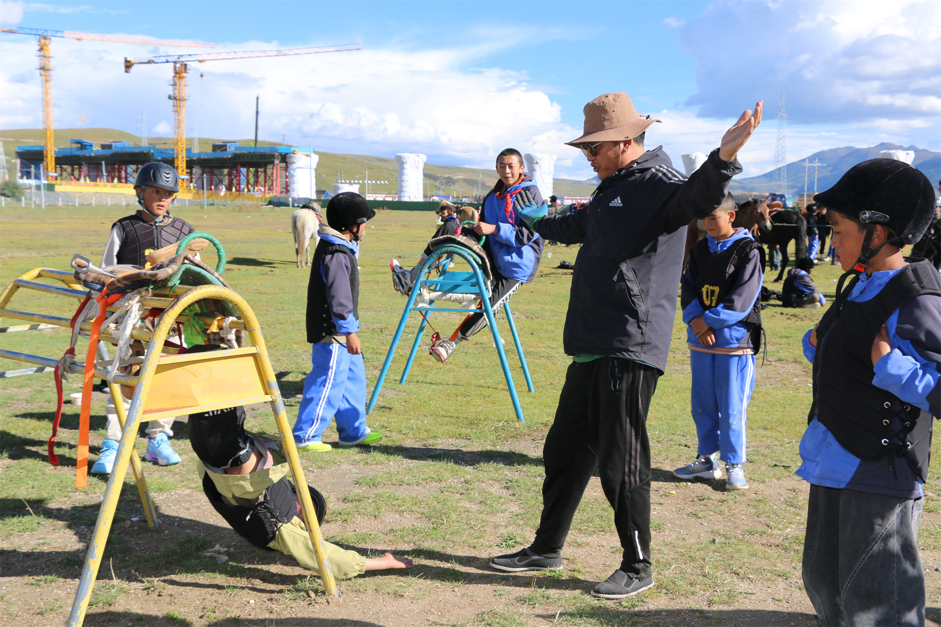圖為參加教學活動的中小學生正在進行模擬騎馬訓練。