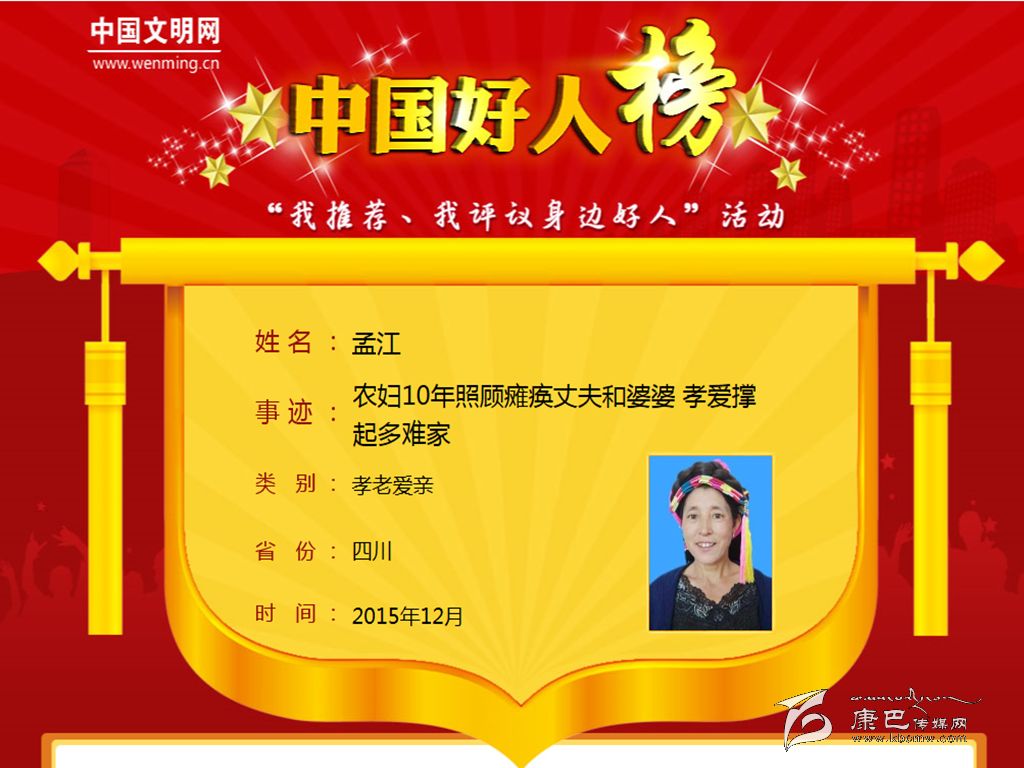 本網(wǎng)訊(丹巴縣委宣傳部)近日,從中央文明辦主辦、中國(guó)文明網(wǎng)承辦的“我推薦、我評(píng)議身邊好人”活動(dòng)中傳來(lái)喜訊,最美媳婦孟江10年照顧癱瘓丈夫和公婆,孝愛撐起多難家入選“中國(guó)好人榜”。