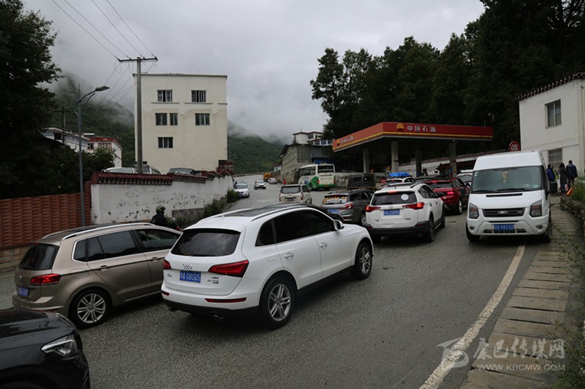 8月7日上午9時10分,中石油康定市折多山加油站,左側(cè)加油進車口排起了長龍,記者目測,在加油站進口處,等待加油的車輛已排成三排,約有六七十米遠,當時等待加油的車輛有43輛。排隊車輛占據(jù)了國道318線此路段一半路面,從折多山方向駛來的車輛很多,有部分車輛沒料到此路段有車輛占道,急忙放緩車速。
