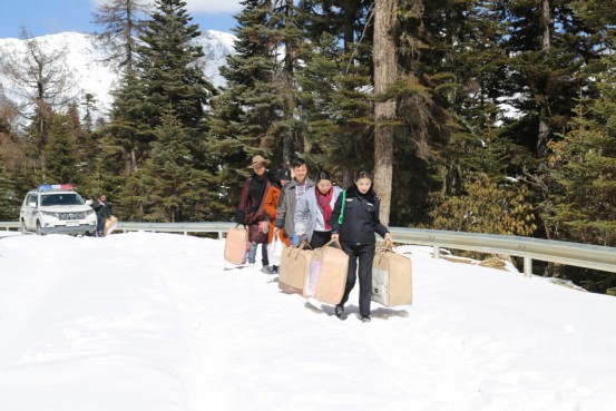 因近日天氣變化浪中村路面積雪過多,工作組棄車步行手提贈(zèng)送物資前往浪中村,到達(dá)浪中村后,工作組了解結(jié)對戶生產(chǎn)生活情況、贈(zèng)送棉被并向村民宣講脫貧攻堅(jiān)政策。