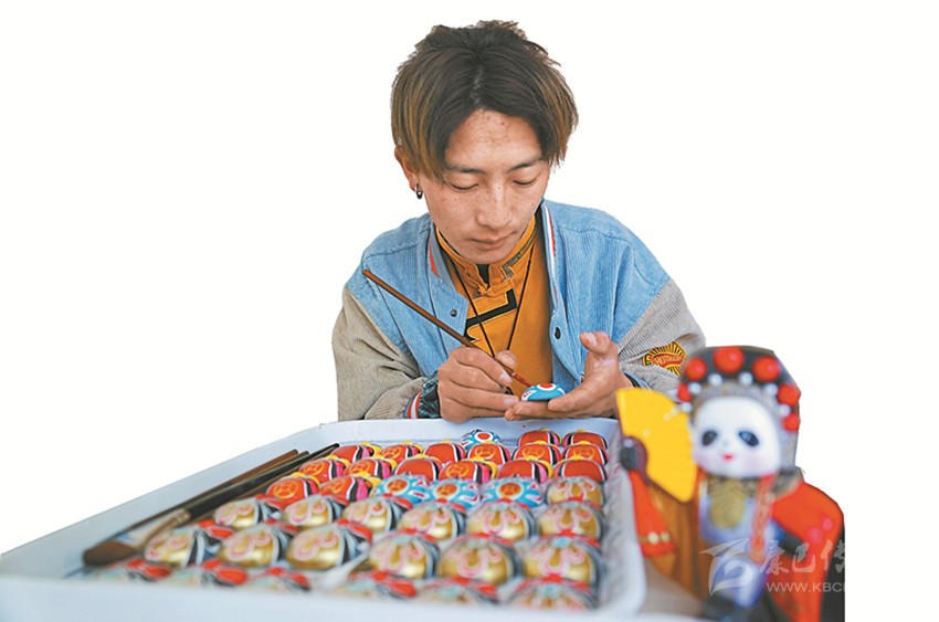 本著自主自愿的原則,教學班結(jié)束后,65名藏族青年主動加入扶貧彩繪實訓班,成為項目的第一批學員?!皩嵱柶陂g不需要交任何費用,還包吃住。我對畫京劇臉譜很有興趣,我們第一個月學習繪畫基本功,第二個月開始,根據(jù)成品質(zhì)量,就可以計件得酬勞,學習期間我每月能掙500多元?!壁雠f。